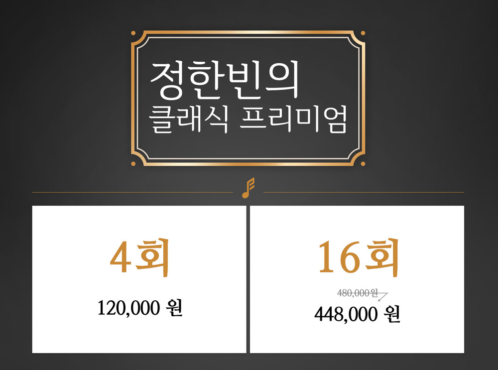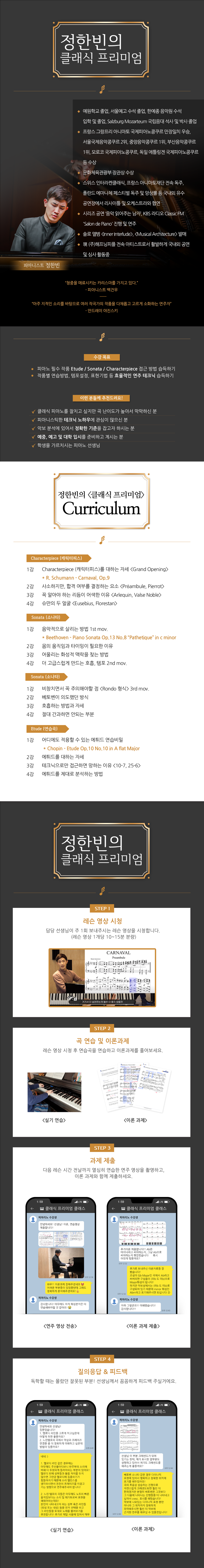A. '정한빈의 클래식 프리미엄' 클래스는 원하는 곡 완성이 아닌 전문 선생님께서 구성해주신 커리큘럼을 통해 클래식 피아노를 체계적으로 배울 수 있는 과정입니다. 원하는 곡을 완성하는 방식의 레슨을 원하신다면 전공클래스를 추천드립니다.