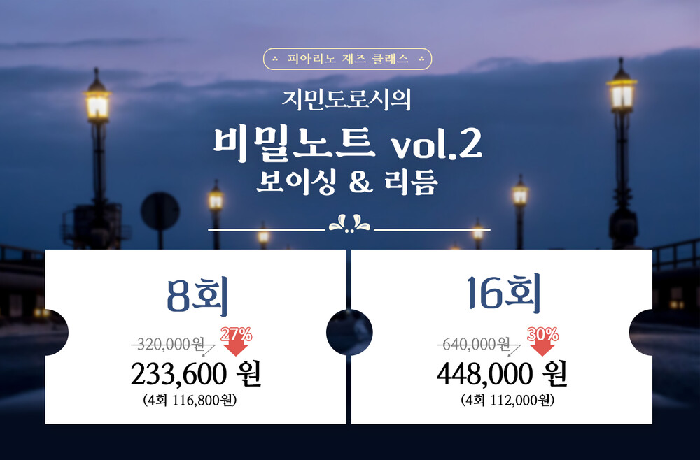 A. 피아리노 재즈클래스 '지민도로시의 비밀노트 Vol.2'는 재즈 고급과정으로 악보를 읽을 줄 알고, 어느정도 음악 이론을 배우신 분들께 추천드립니다. 피아노를 처음 배우신다면, 첫걸음 클래스 수강을 우선 추천드리며, 코드를 알고 재즈를 처음 배우시는 분이시면 <비밀노트 Vol.1>을 추천드립니다.