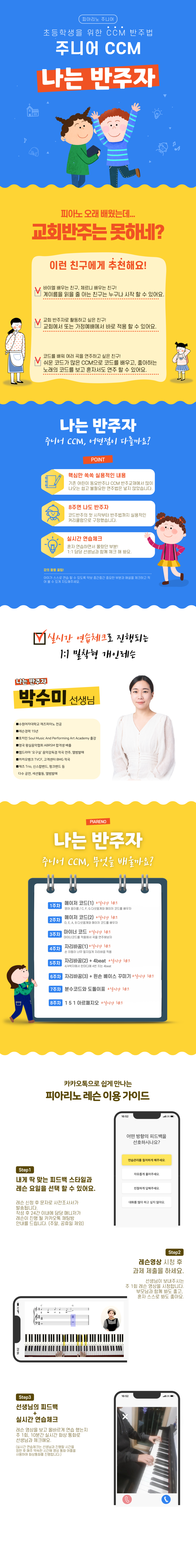 A. <나는 반주자> 클래스는 원하는 곡 완성이 아닌 전문 선생님께서 구성해주신 커리큘럼을 통해 코드반주를 체계적으로 배울 수 있는 과정입니다. 원하는 곡을 완성하는 방식의 레슨을 원하신다면 <주니어 클래스>에서 수미쌤을 만나실 수 있습니다.
