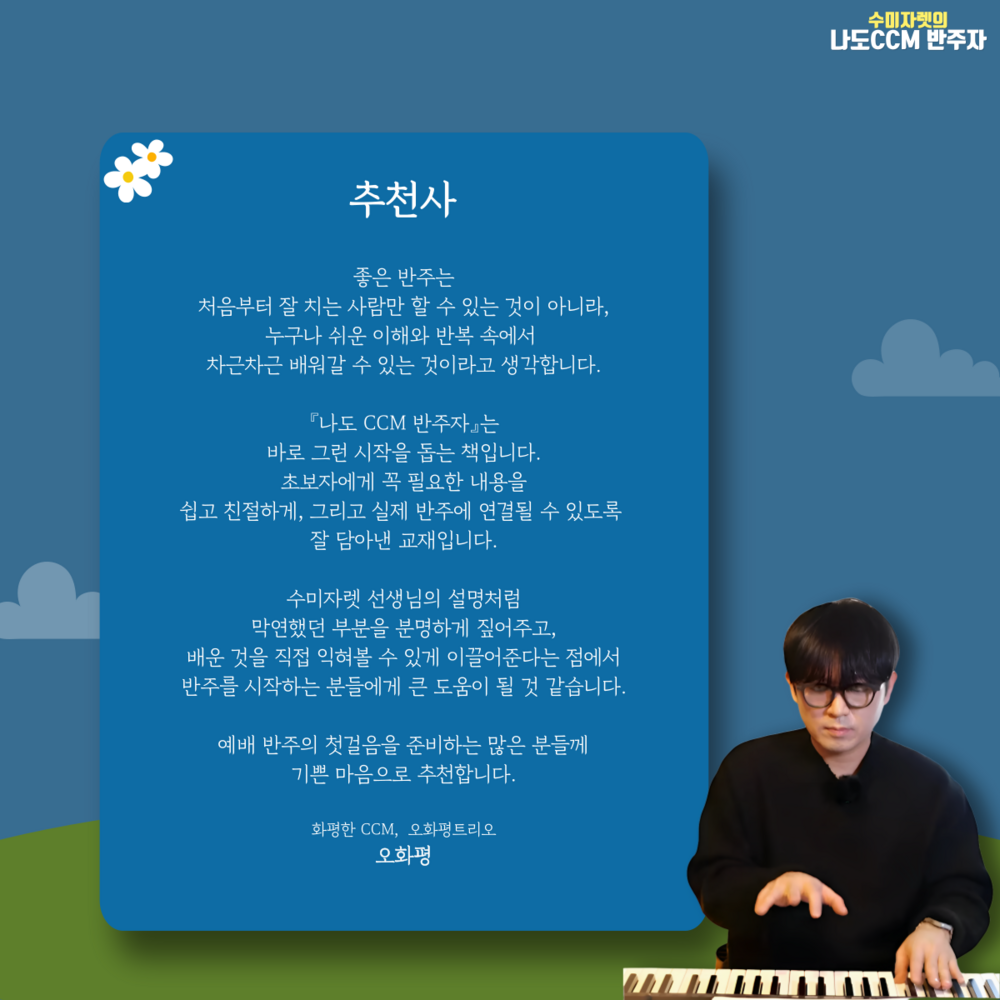 이 교재가 여러분의 ‘마음은 간절하지만 손가락은 굳어버리는 순간'을 지나기쁘게 찬양하고, 당당하게 연주하는 단계로 나아가는 데 든든한 가이드가 되길 바랍니다.