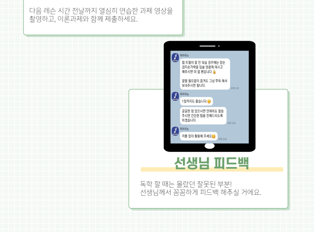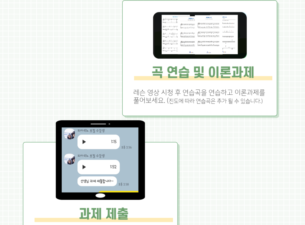 정해진 일정에 연습 및 과제 제출이 불가능하다고 미리 통보하지 않았거나 연락이 되지 않는 경우, 정해진 요일에 레슨이 그대로 진행되며 이때 진행된 레슨은 횟수가 차감됩니다.
