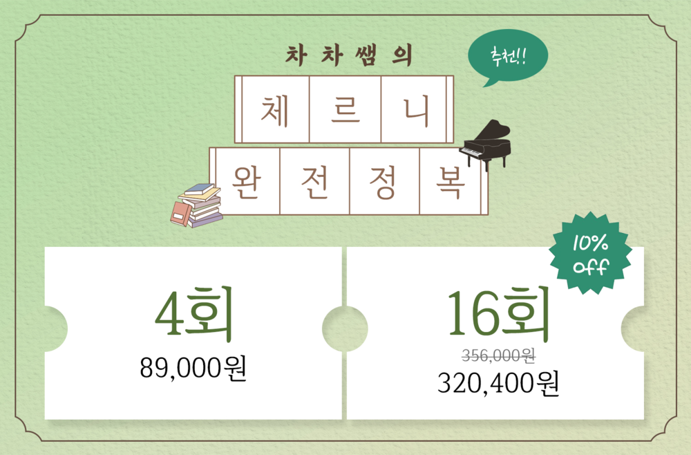 A. 100번, 30번 그리고 40번 과정 각각 16회 레슨 수강 시 '체르니 정복하기' 클래스 모든 강의를 완강할 수 있습니다.