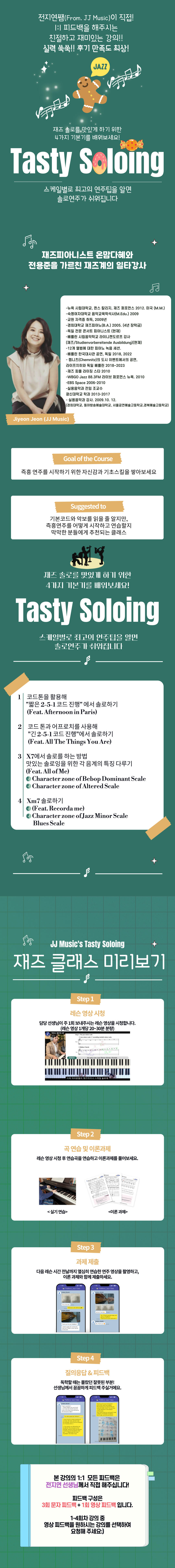 A. '맛있는 솔로잉' 클래스는 원하는 곡 완성이 아닌 전문 선생님께서 구성해 주신 커리큘럼을 통해 재즈를 체계적으로 배울 수 있는 과정입니다. 원하는 곡을 완성하는 방식의 레슨을 원하신다면 개인레슨 클래스를 추천드립니다.